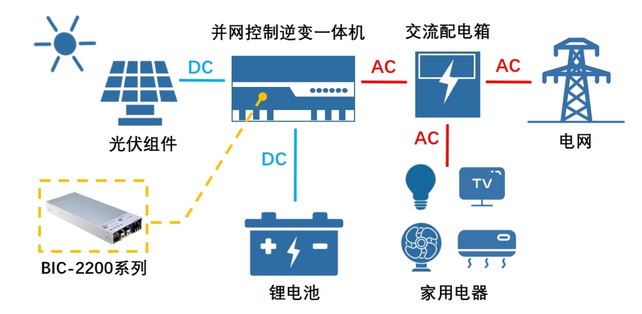 家用儲(chǔ)能系統(tǒng)(如圖2..),主要包括光伏組件、鋰電池、并網(wǎng)控制逆變一體機(jī)和家用電器等。在夜間把電力系統(tǒng)的低價(jià)電力,通過(guò)一體機(jī)內(nèi)部的BIC-2200對(duì)鋰電池充電儲(chǔ)能;在白天電網(wǎng)高負(fù)荷的時(shí)候,鋰電池再經(jīng)BIC-2200反向輸出能量并回饋至電力系統(tǒng),不僅可以削峰填谷,減輕電網(wǎng)波動(dòng),還能為家庭節(jié)省電力開(kāi)支。