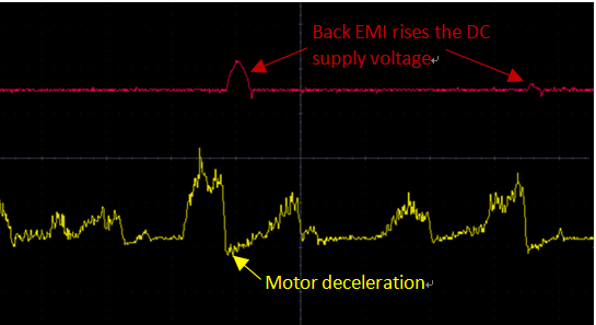 當(dāng)使用直流電壓為馬達(dá)(尤其是伺服馬達(dá))供電時,馬達(dá)在減速過程中通常會產(chǎn)生反電動勢。這將造成反向電流而饋回直流電源電壓,并對直流電源輸出電容器組充電。因此,在反向電流對電容器組充滿電后,直流電源電壓將觸發(fā)過電壓保護(hù)功能。圖1描述了馬達(dá)減速期間直流電源電壓的上升現(xiàn)象。